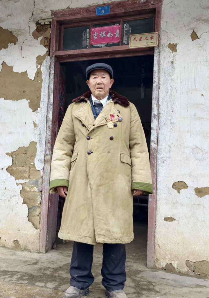 当我们抵达时,老人早已等在老屋门前。他身上那件旧式的黄色羊皮军大衣,在晨光下格外显眼,门楣上“光荣之家”的牌匾,与之交相辉映。1937年1月出生的周益钦,身上带着一个时代的传奇。