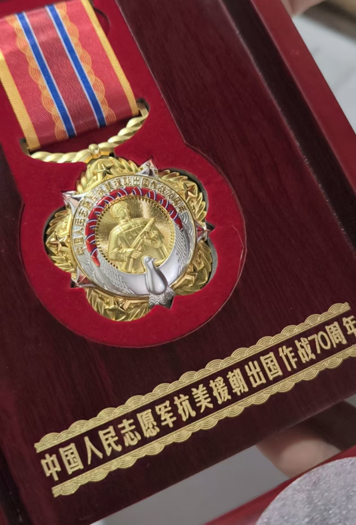 堂屋里,周老端坐在木桌旁,胸前的勋章在透过木窗的光线下闪闪发亮。他小心翼翼地从朱漆木匣中取出“中国人民志愿军抗美援朝出国作战70周年”纪念章,红黄蓝三色的绶带,仿佛还带着当年的赤诚与信念。