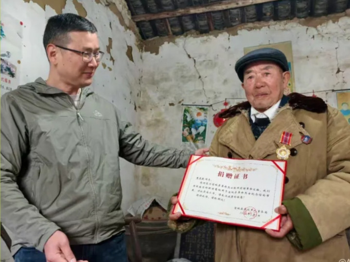 退役军人事务局给抗美援朝老兵周益钦并颁发捐赠证书